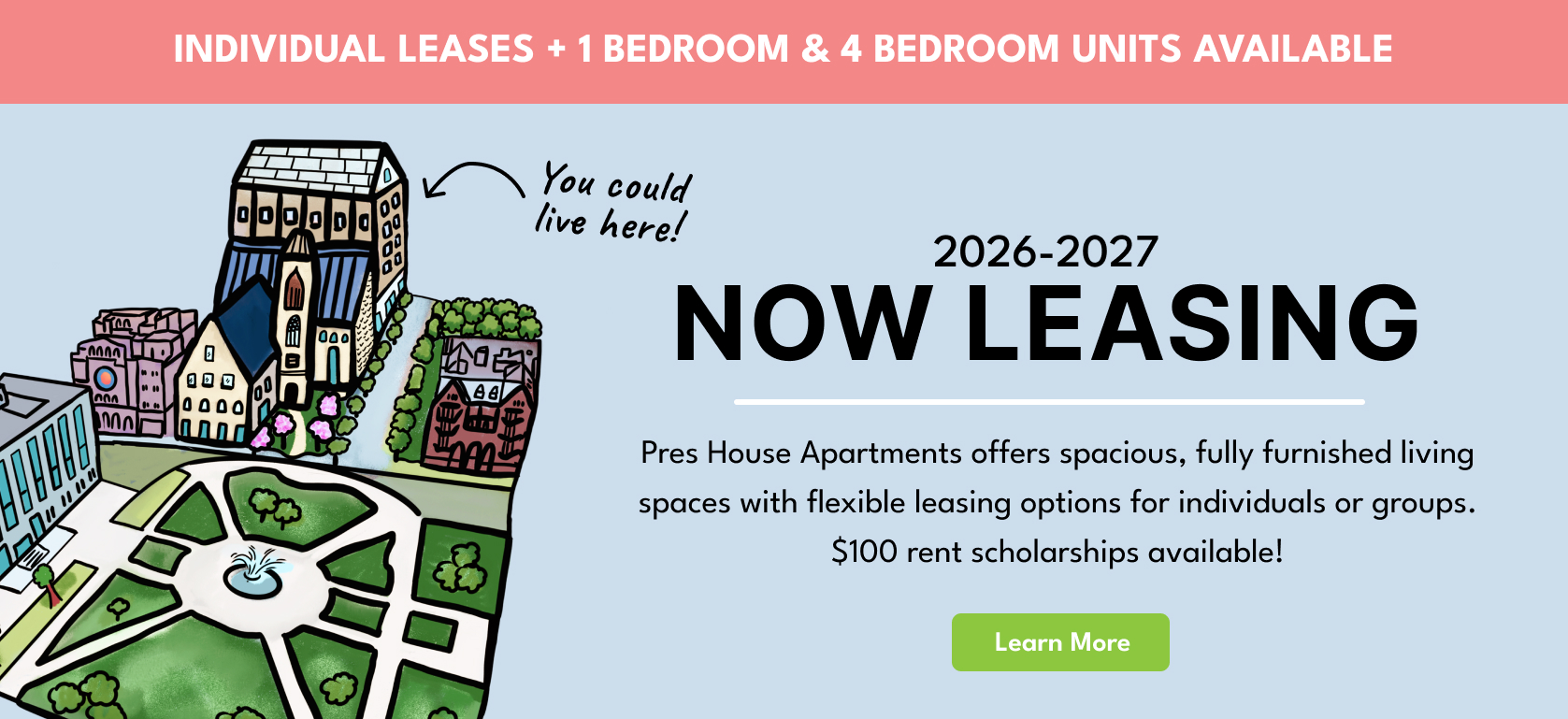 Rent Scholarships: Pres House Apartments exists to benefit residents, not to profit owners. Pres House is a non-profit whose mission is to serve the community through programs and scholarships that help pay for rent and enrich residents’ experience.